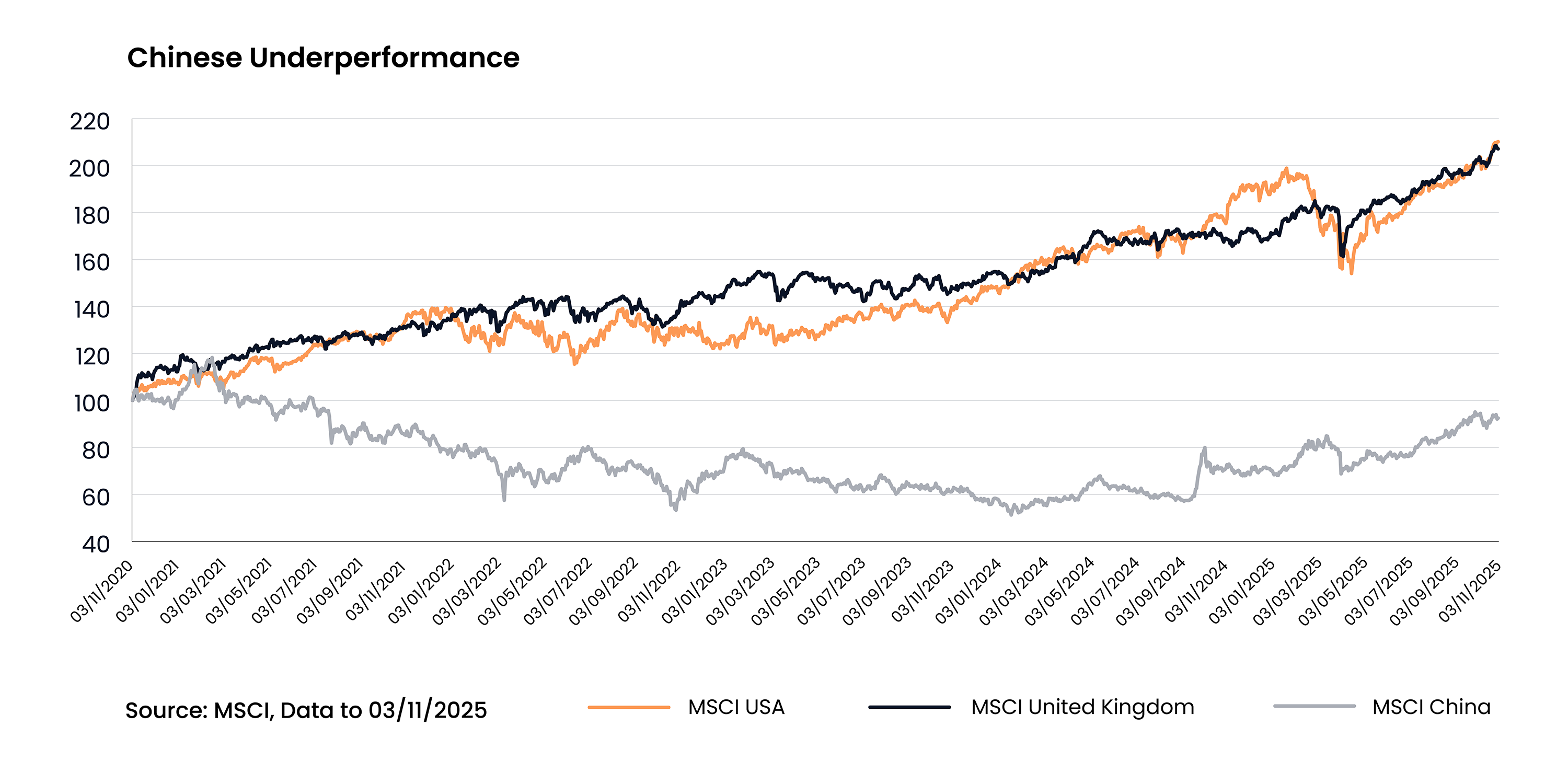 - Chinese equities have underperformed Western peers since Covid