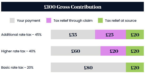 For most basic rate taxpayers, the 20% tax relief is added ‘at source’ which means it’s done automatically when you pay into your pension. If you are a higher, or additional rate taxpayer, then you will still receive 20% at source, but you will also be able to claim the higher or additional rate pensions tax relief (an extra 20% or 25% respectively) via HMRC.