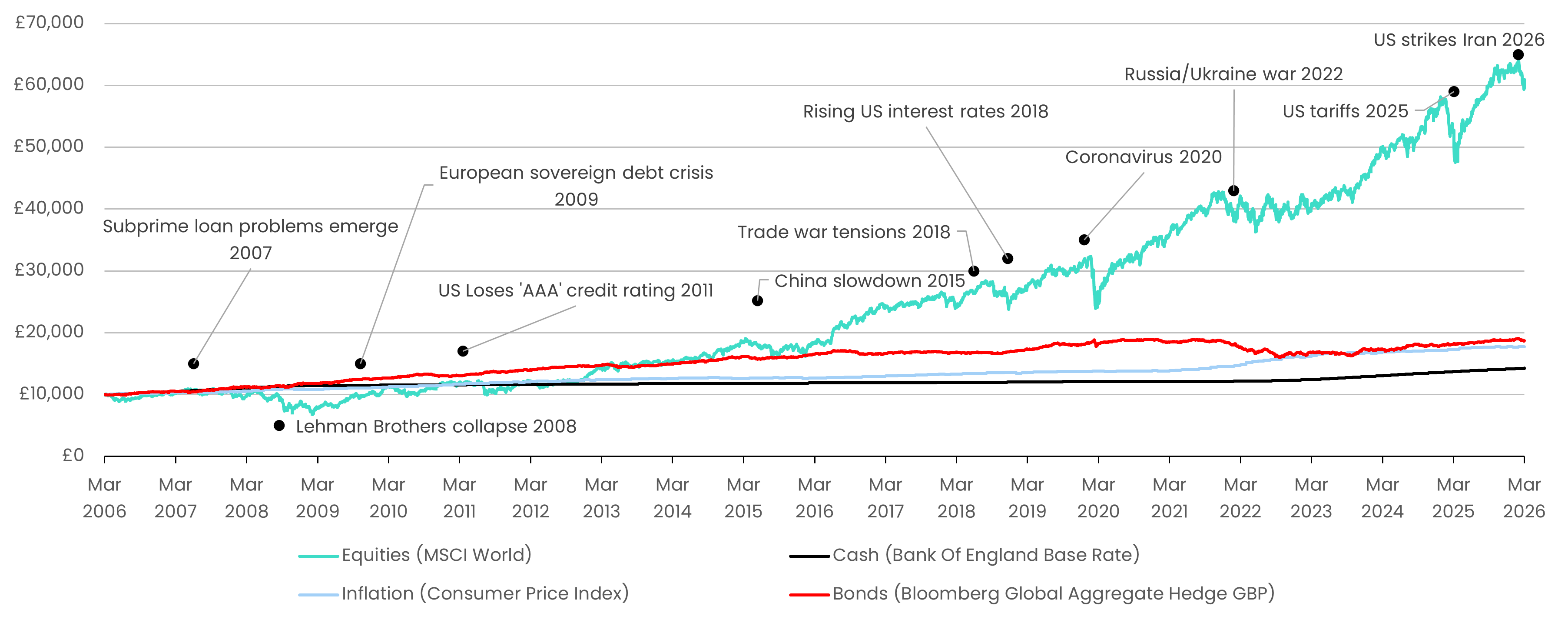 Just look at the past 20 years. Over that time frame we have experienced a global financial crisis, rising interest rates, a pandemic, Russia/Ukraine war and US tariffs. And yet £10,000 invested in global equities (the MSCI World index) in March 2006 would be worth around £60,000 by March 2026. Cash (Bank of England rate) would have turned that £10,000 into around £15,000 over the same time frame.