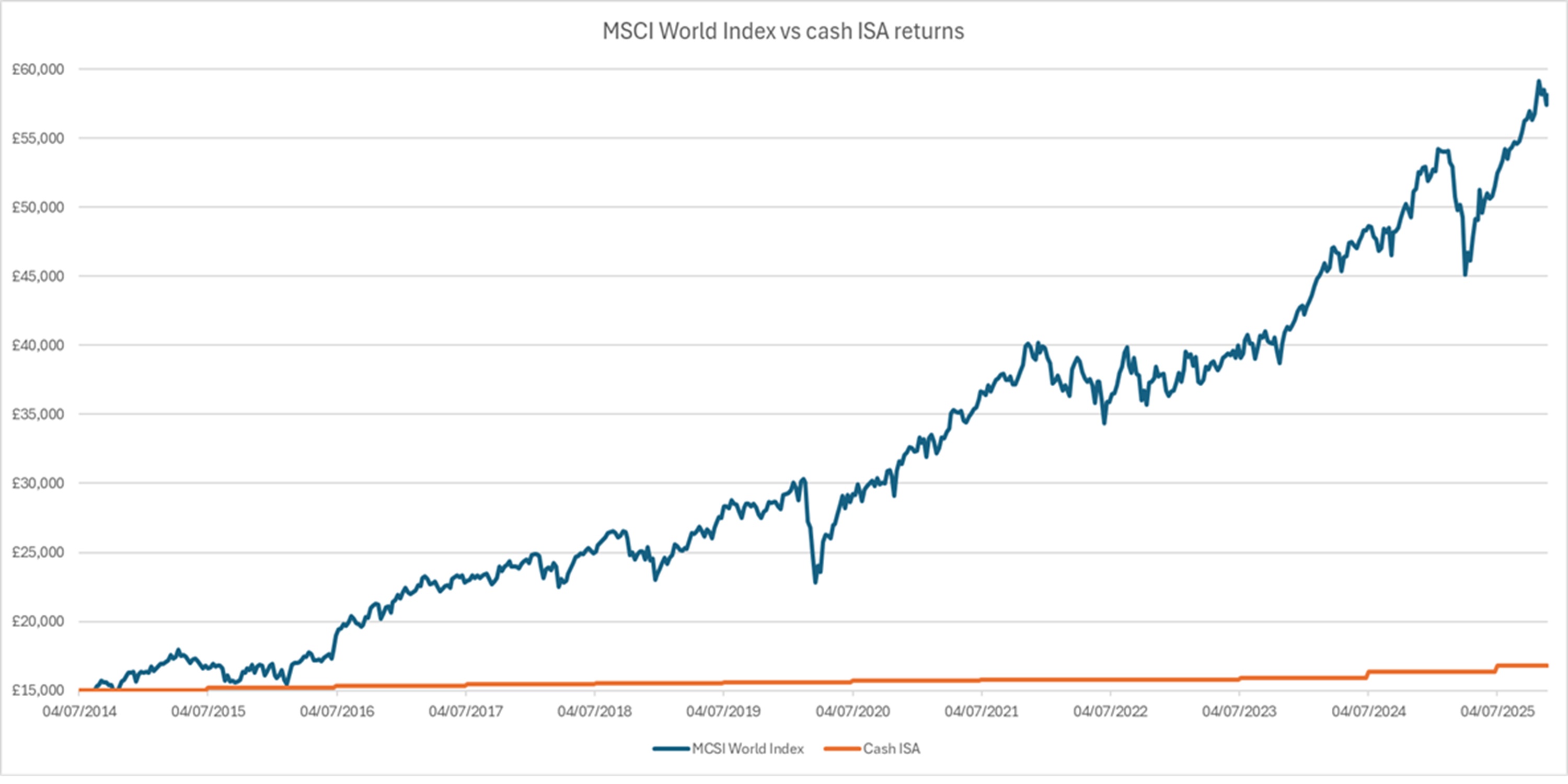 Chart: Cash ISA returns vs MSCI World Index returns. Based on £15,000 invested on 4 July 2014. Data as of 24 November 2025. Sources: Bloomberg, Bank of England.
