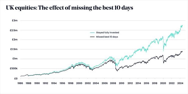 After all, history demonstrates the benefits of staying invested. A £100,000 investment made in 1986 would have grown to £2.5 million in real terms by the end of September 2024. However, missing just the 10 best performing days over that period would have reduced the final value by £1.25 million – a substantial difference that underscores the potential long-term cost of trying to time the market.