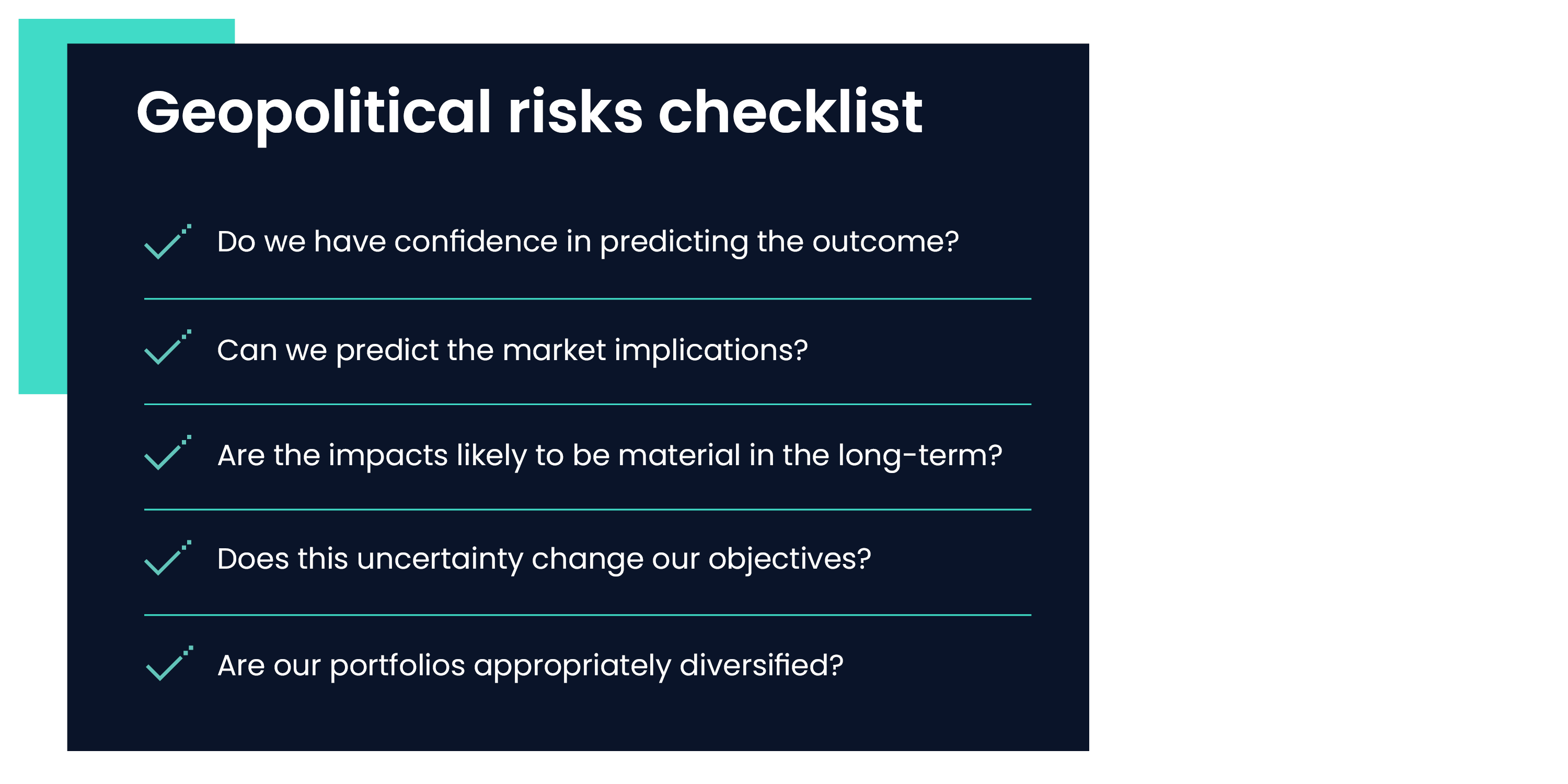 When uncertainty is high, then by definition the conviction in making any decision must be lower. Therefore, the threshold for making changes should be higher. We have created a geopolitical checklist that helps us to navigate world events in a disciplined way.
