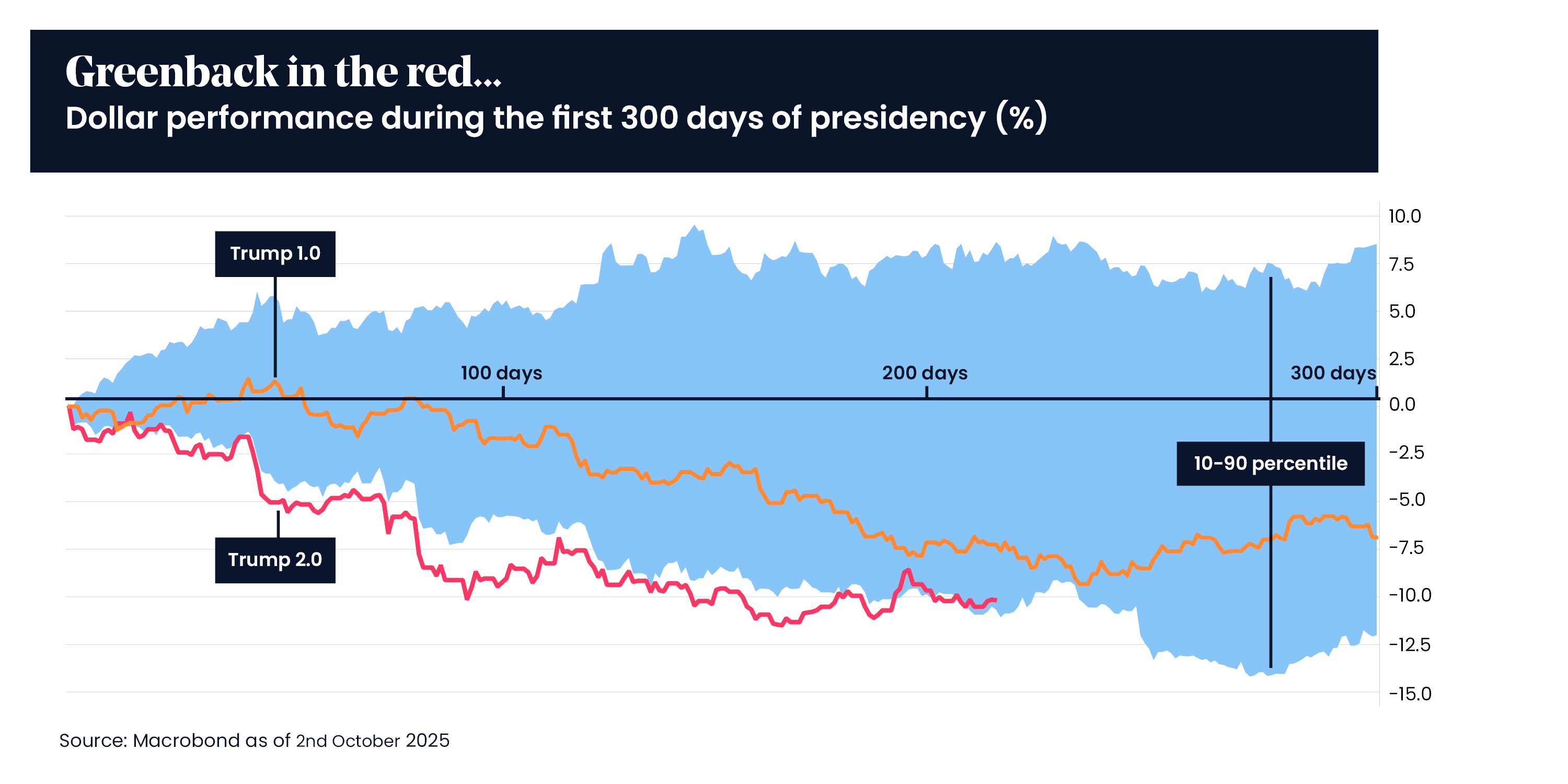 The chart below tracks the performance of the US dollar over the first 300 days of both Trump presidencies. The lines are showing the decline of the dollar, with both terms showing significant weakness. Notably, Trump 2.0 reflects an even